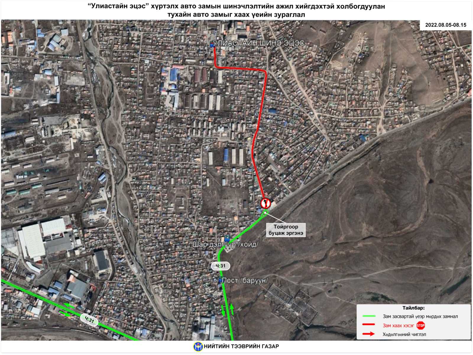 Иймд иргэд та бүхэн зам хаах хугацаанд Ч:31 "Улиастай - Баянбүрд - Зам гүүрийн авто бааз", Ч:36 "Гачуурт - Офицеруудын ордон - Жуковын музей" чиглэлүүдээр үйлчлүүлнэ үү.