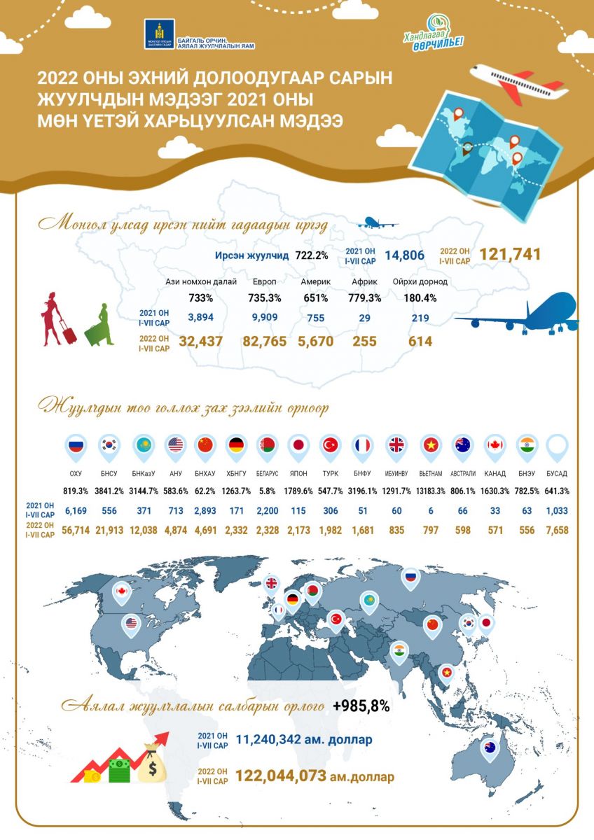 2022 оны нэгдүгээр сарын нэгнээс долоодугаар сарын 30 хүртэлх хугацаанд нийт 121 мянга 741 гадаад жуулчин Монгол Улсад иржээ. Дурдвал,