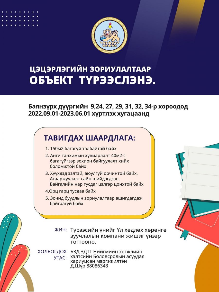 Баянзүрх дүүргийн 9,24,27,29,31,34 дүгээр хороодод цэцэрлэгийн зориулалтаар объект түрээслэнэ. Тавигдах шаардлага: