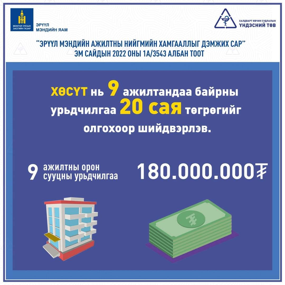Энэ хүрээнд Халдварт өвчин судлалын үндэсний төв есөн ажилтандаа орон сууцны урьдчилгаа болгон тус бүр 20 сая төгрөгийн урамшуулал олгохоор шийдвэрлэсэн байна.