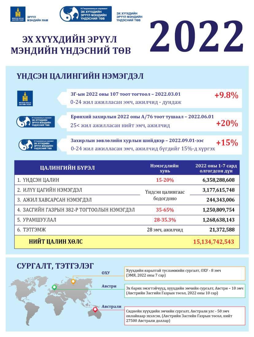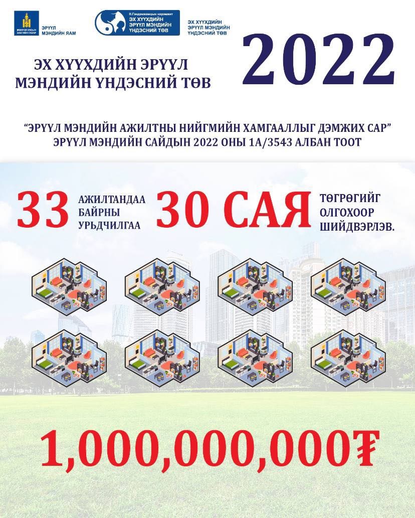 Эрүүл мэндийн сайд С.Энхболд тушаал гарган 2022 оны наймдугаар сарыг Эрүүл мэндийн салбарын ажилчдын нийгийн хамгааллыг дэмжих сар болгон зарласан. Энэ хүрээнд эмнэлэг бүр ажилчдынхаа цалинг боломжоороо нэмж, зарим ажилтанд гэр, байрны урьдчилгаа зэргийг олгож байна.