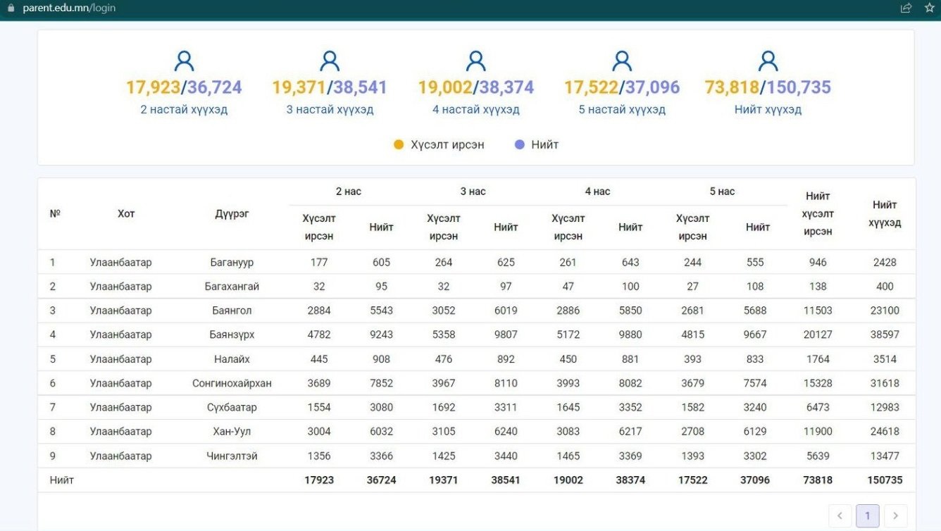 Нийслэлийн цэцэрлэгийн элсэлт, бүртгэлийг энэ сарын 10-ны өдрөөс эхлэн "E-Mongolia" цахим системээр зохион байгуулж байна. Өнөөдрийн байдлаар нийслэлд цэцэрлэгийн насны нийт 73,818 хүүхдийн бүртгэл амжилттай хийгджээ.