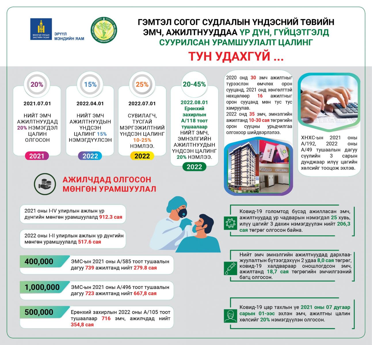 Энэхүү сарын хүрээнд Эрүүл мэндийн сайдаас өгсөн үүрэг чиглэлийн дагуу ГССҮТөвийн удирдлагууд нийт эмч, эмнэлгийн ажилтнуудынхаа үндсэн цалинг 20-45 хувиар нэмж, 35 ажилтанд орон сууц авахад нь зориулж, 30 хүртэлх сая төгрөгийн орон сууцны урьдчилгаа олголоо.