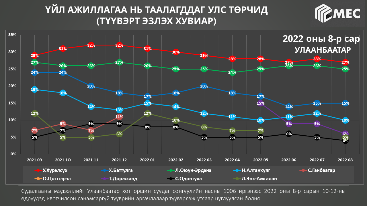 Сар бүр MEC судалгааны байгууллагаас улстөрчдийн чансааг тодорхойлж, түүнийгээ олон нийтэд ил тод зарладаг. Энэ жишгээр тэд 2022 оны НАЙМДУГААР САРЫН судалгааны дүнгээ танилцуулав. Судалгааг санамсаргүй түүврийн аргаар 1006 хүнтэй утсаар холбогдож, авчээ.
