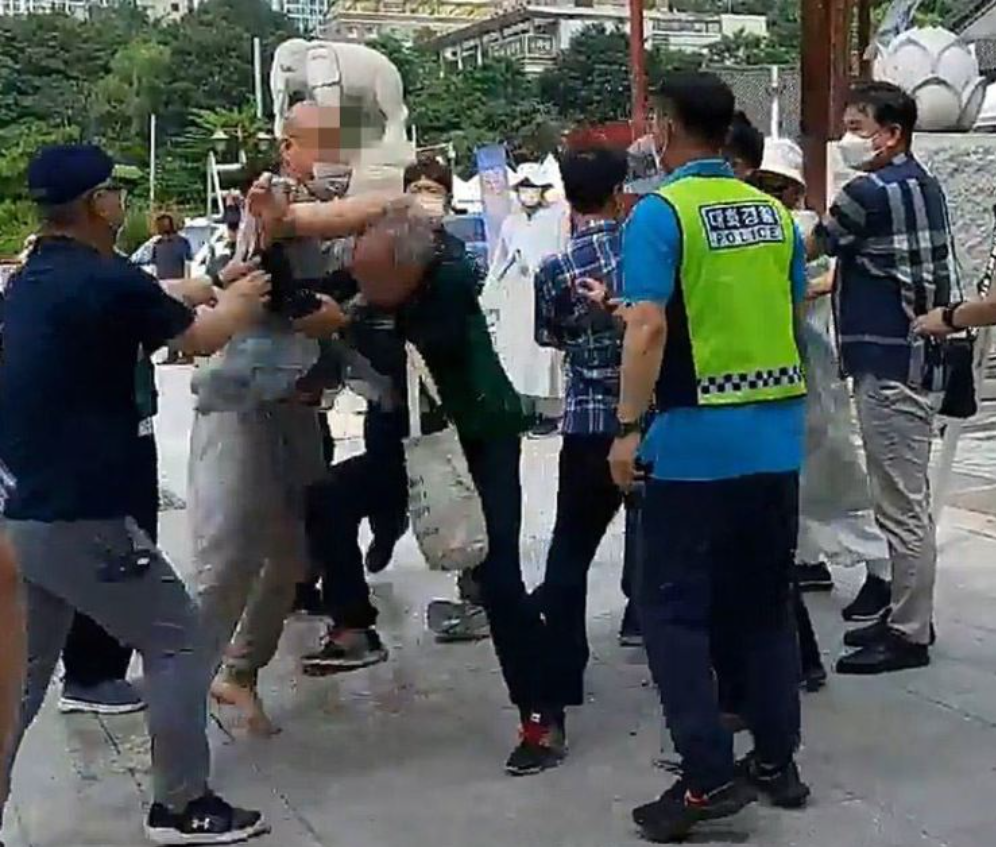 Ганнам дүүрэг дэх "Bonguensa" сүмийн өмнө эсэргүүцлээ илэрхийлж байсан хохирогч руу хоёр лам дөхөж ирэн өшиглөж, цохих зэргээр биед нь халдсан бөгөөд хувинтай ялгадас дээрээс нь асгажээ. Үүнд цагдаа нар ч мөн өртсөн тухай эх сурвалжууд мэдээллээ.