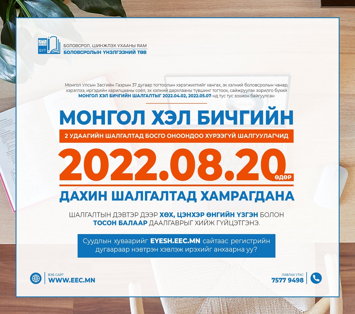 Энэ хүрээнд МОНГОЛ ХЭЛ, БИЧГИЙН ШАЛГАЛТЫГ 2022.04.02, 2022.05.07-нд тус тус зохион байгуулсан. Энэхүү 2 удаагийн шалгалтад босго оноондоо хүрээгүй шалгуулагчид маргааш /2022.08.20/ дахин шалгалтад хамрагдана.