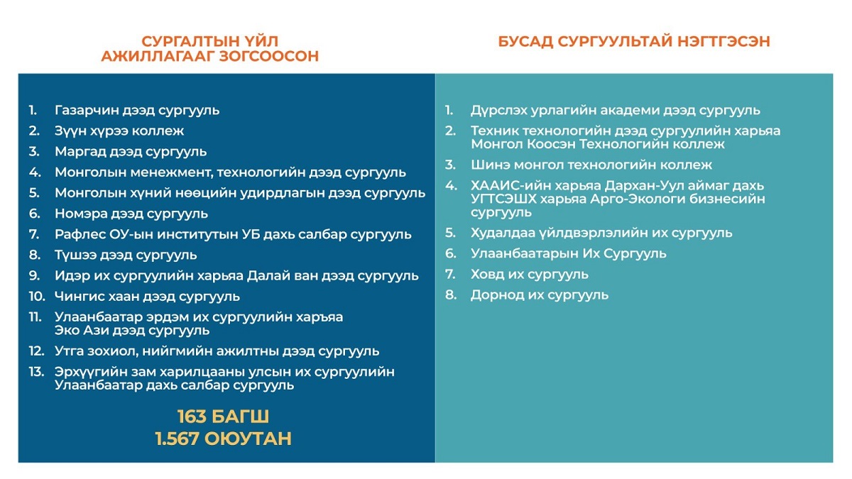 Сургалтын үйл ажиллагааг зогсоохоос гадна сургуулиудын хөтөлбөрт мөн шалгалт хийж хүчингүй болгож байна. Өнгөрсөн хичээлийн жилд их, дээд сургуулиуд 2564 хөтөлбөрөөр мэргэжилтэн бэлтгэж байсан бол 908 хөтөлбөрийг хүчингүй болголоо. Ингэснээр 1656 хөтөлбөр хүчин төгөлдөр хэрэгжих юм.