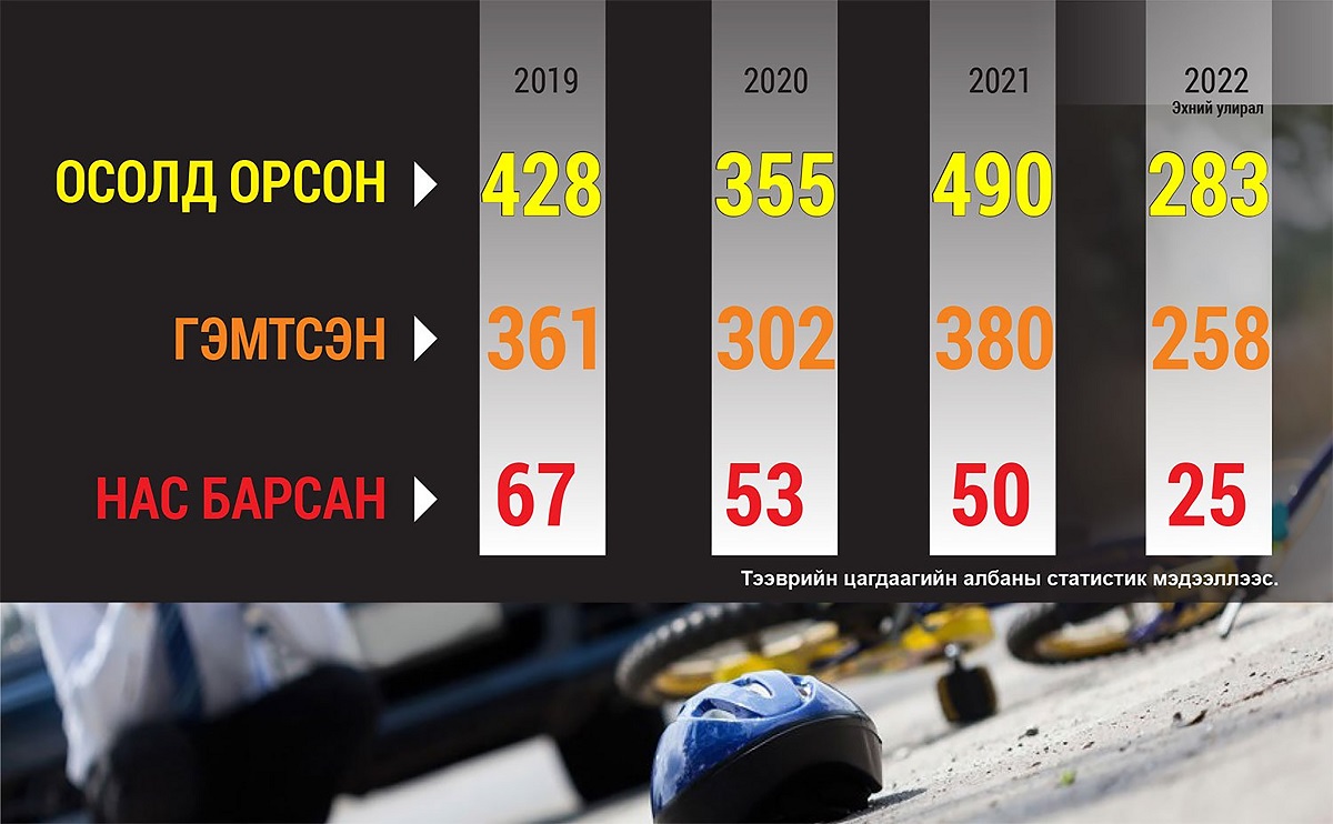 Жилдээ хэдэн зуугаар тоологдох хүмүүс хорвоог орхисоор байна. Энэ байдлаар таван жил, арван жил, 20 жил үргэлжилбэл хэчнээн олон мянган монгол хүн автын ослоор амьдралаа орхих вэ. Бодоод үзэхээр аймшигтай тоо гарна. Тэр дундаа эцэг эхийн хайхрамжгүй байдал, хайнга жолооч нараас болж бага насны хүүхдүүд эрүүл мэнд, амь насаараа хохирсоор байна. Энэ талаар Тээврийн цагдаагийн албаныхан бага насны хүүхдээ асран хамгаалагчгүйгээр замын хөдөлгөөнд оролцуулахгүй байхыг сэрэмжлүүлдэг. Гэвч зам тээврийн осол буурахгүй байгаа нь харамсалтай. Гэмтэл согог судлалын үндэсний төв өндөр ачаалалтай ажиллаж байна. Мэдээж ихэнх нь осол аваарьт орсон иргэдийн ачаалал байгаа нь тодорхой. Согтуугаар тээврийн хэрэгсэл жолоодох, гэрлээ шилжүүлэхгүй байх, хурд хэтрүүлэх, хамгаалалтын бүсээ зүүгээгүй зэрэг зөрчлүүдээс болж хүний амь нас хохирсон ноцтой хэрэг гарсаар байна.