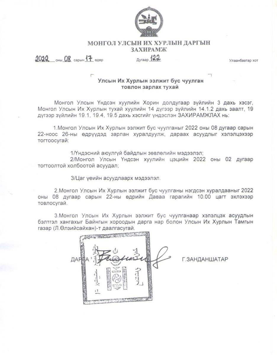 Монгол Улсын Их Хурлын дарга Г.Занданшатар Монгол Улсын Үндсэн хуулийн Хорин долдугаар зүйлийн 3 дахь хэсэг, Монгол Улсын Их Хурлын тухай хуулийн 14 дүгээр зүйлийн 14.1.2, 19 дүгээр зүйлийн 19.1, 19.4, 19.5 дахь хэсгийг тус тус үндэслэн Монгол Улсын Их Хурлын ээлжит бус чуулганыг 2022 оны 08 дугаар сарын 22-ноос 26-ны өдрүүдэд товлон зарлах тухай захирамж гаргалаа.
