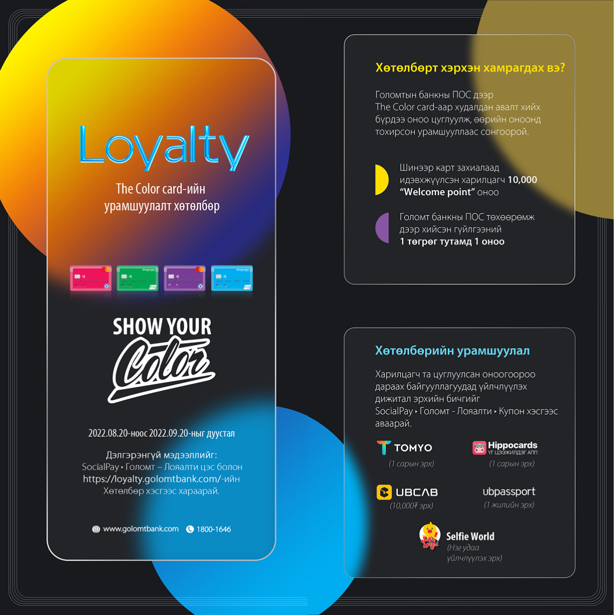 Өнгөлөг картын урамшууллын талаар сонирхсон зүйлээ Харилцагчийн үйлчилгээний төвийн 1800-1646 дугаарт холбогдон лавлаарай.