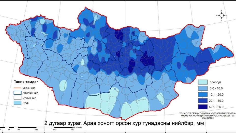 Тодруулбал, Увс, Баянхонгор, Архангай, Өвөрхангай, Хөвсгөл, Булган, Орхон, Сэлэнгэ, Төв, Говьсүмбэр, Дундговь, Хэнтий, Сүхбаатарын зарим, Дархан-Уул, Дорнодын ганц нэг сумдын нутгаар 20.1-50.0 мм, Булганы Дашинчилэн, Хангал, Сэлэнгэ, Төвийн Баян-Өнжүүл, Эрдэнэ, Баянжаргалан, Баян, Дундговийн Адаацаг, Хэнтийн Дэлгэрхаанд 50.1-86.9 мм оржээ.