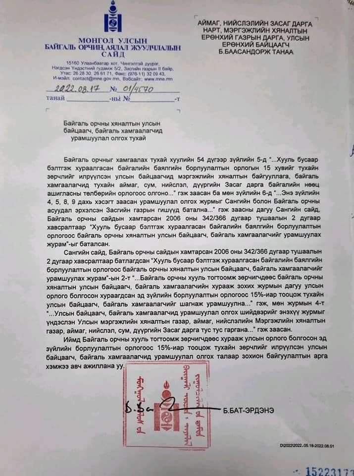 Иймд Байгаль орчны хууль тогтоомж зөрчигчдөөс хурааж улсын орлого болгосон эд зүйлийн борлуулалтын орлогоос 15%-иар тооцож тухайн зөрчлийг илрүүлсэн улсын байцаагч, байгаль хамгаалагчид урамшуулал олгох талаар зохион байгуулалтын арга хэмжээ авч ажиллахыг хүслээ.