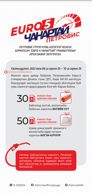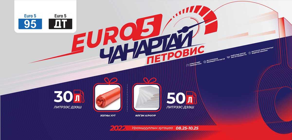 "Петровис Групп" хувь хэрэглэгчдэдээ зориулсан, чанартай шатахууны “Евро-5 - Чанартай” урамшууллыг наймдугаар сарын 25-аас орон даяар эхлүүлж байна.