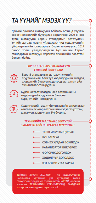 Одоо манайд явж буй ихэнх автомашинууд Евро-5 стандартын шатахуун хэрэглэх заалттай боловч автомашины техникийн гэрчилгээн дээр бичигдээгүй өөр шатахуун хийснээс болж түлшний зарцуулалт нэмэгдэх, хүч багасах, сэвчээ хурдан бохирдох, катализатор бөглөрөх, форсунк доголдох, хэт бохир утаа гаргах зэрэг асуудлууд түгээмэл гарч байна. Тиймээс ЭРХЭМ ЖОЛООЧ та хөдөлгүүрийн насжилтаа уртасгаж, урт хугацаанд гарах санхүүгийн эрсдэлээс сэргийлж ЧАНАРТАЙ, өөрийн машины ТЕХНИКИЙН ГЭРЧИЛГЭЭНД ЗААГДСАН тохирсон шатахууныг хэрэглээрэй.