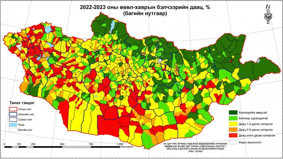 Засгийн газрын 286 дугаар тогтоолын дагуу Ус цаг уур, орчны судалгаа, мэдээллийн хүрээлэнд 2022-2023 оны өвөл, хаврын бэлчээрийн даацыг баг бүрийн бэлчээрийн ургац, малын тоо, бэлчээрийн талбайн хэмжээ, бэлчээр ашиглах хугацаа зэрэг мэдээлэлд үндэслэн багийн нутгаар тооцоолжээ.