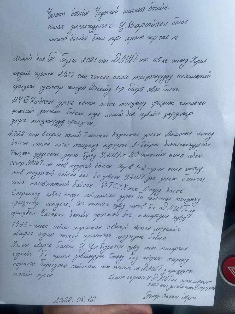Өнгөрсөн долоо хоногт МЧБХ-ны ерөнхийлөгч Х.Бадамсүрэн, ЕНБД П.Буяндэлгэр, шигшээ багийн багш нарт зориулж, надад боломж олгож, УАШТ-ны аварга болсон тамирчинтай сорилго барилдаан хийлгэж, хэн ялсныг нь ДАШТ-д оролцуулах хүсэлт өгсөн. Өнөөдөр би ДАШТ-д оролцохгүй байж болно оо. Гол нь цаашдаа УАШТ болон, ДАШТ-ны сорилгын хугацаагаа дор хаяж 2 сарын өмнө гаргадаг байж, дүрэм журмаа тодорхой болгож байхгүй бол дараа үеийн олон тамирчид хохирч үлдэхээр байна.