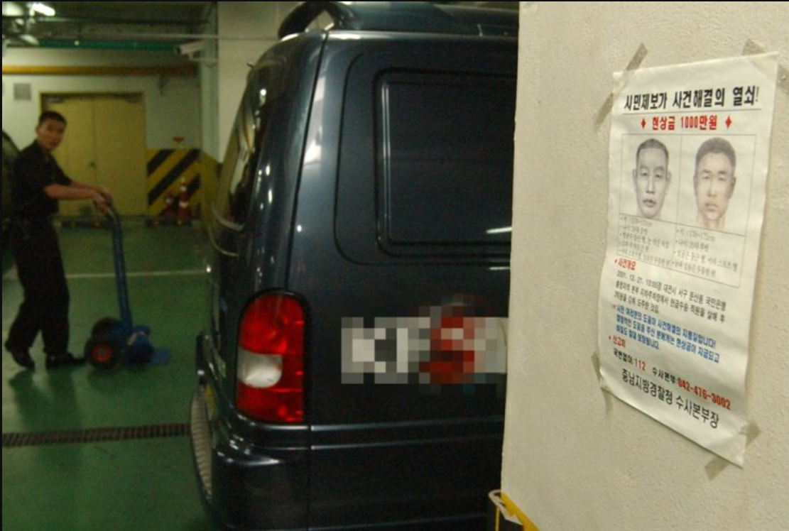 Сэжигтнүүд 2001 оны арванхоёрдугаар сарын 21-ны өдрийн 10 цагийн орчимд "KB Kookmin" банкны салбар дахь зогсоолд 40 орчим насны банкны ажилтныг буудан, 300 сая гаруй вон хулгайлан зугтсан аж.