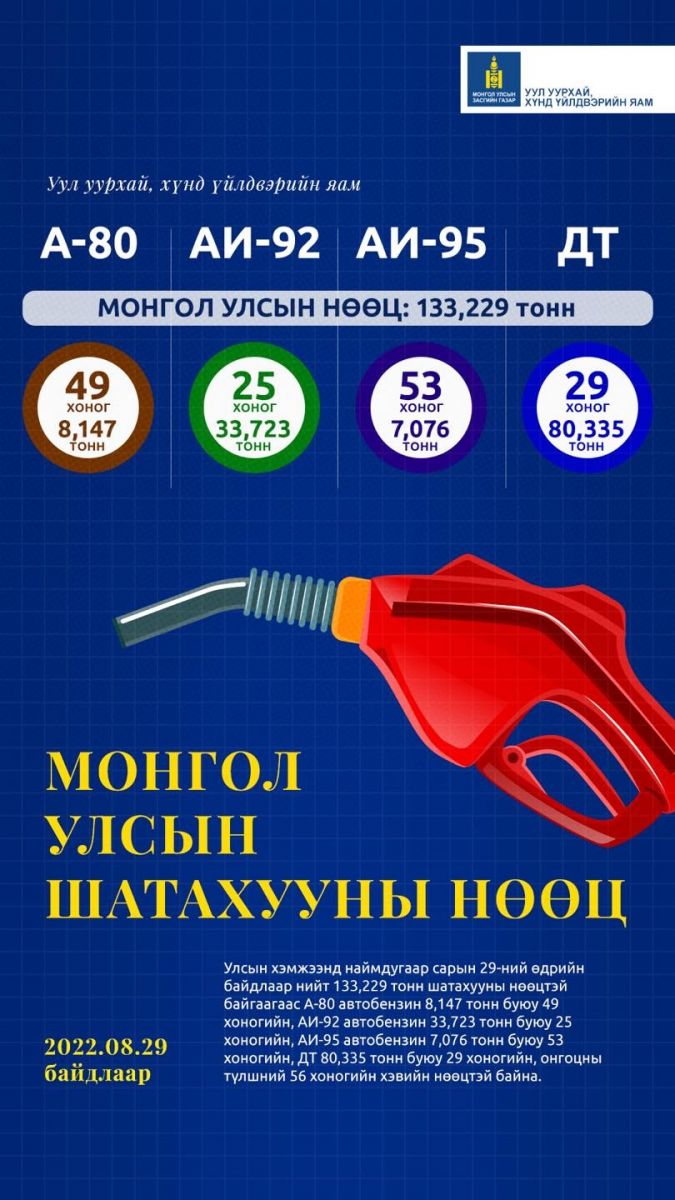 Улсын хэмжээнд наймдугаар сарын 29-ний өдрийн байдлаар нийт 133,229 тонн шатахууны нөөцтэй байгааг УУХҮЯ-аас мэдээллээ.
