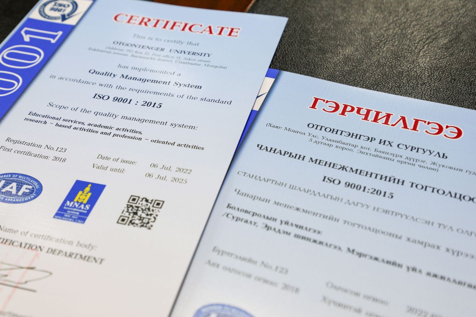 Өнгөрсөн хичээлийн жилд манай хамт олон чанарын удирдлагын тогтолцооны стандартын 2 дахь шатны баталгаажуулалтыг Дээд боловсрол олгох үйл ажиллагаа, Эрдэм шинжилгээ, судалгааны үйл ажиллагаа, Боловсролын бусад үйл ажиллагаа, үйлчилгээний хамрах хүрээнд хийлгэж, үл тохирол, анхааруулга, сайжруулах нөхцөлгүйгээр 100 хувь амжилттай хамгаалжээ.