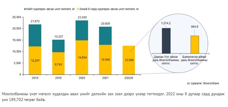 Монголбанкны худалдан авсан үнэт металлын хэмжээ (2018-2022/08