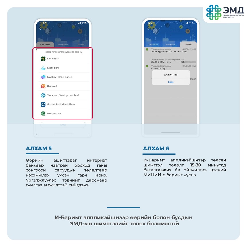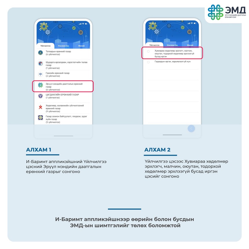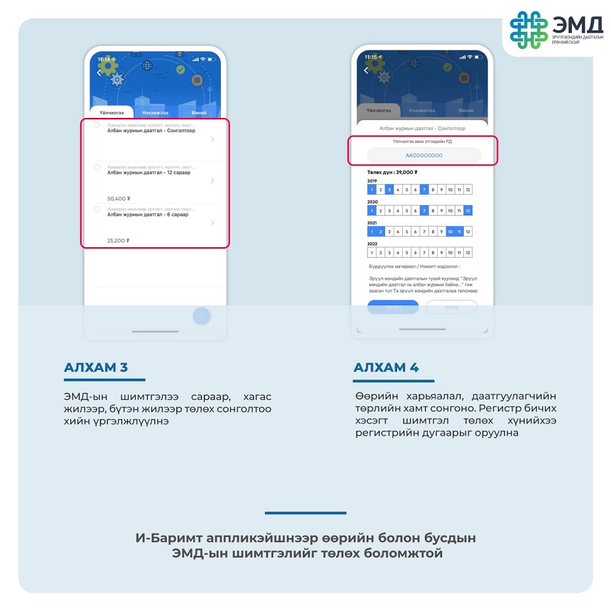Та И-Баримт аппликэйшнээр өөрийн болон бусдын ЭМД-ын шимтгэлийг хялбархан төлөх боломжтой.