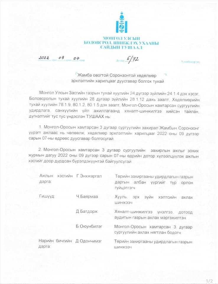 Боловсрол, шинжлэх ухааны сайд 2022 оны есдүгээр сарын 07-ны өдөр Жамба овогтой Соронзонтой хөдөлмөр эрхлэлтийн гэрээг дуусгавар болгох тухай тушаал гаргасан.