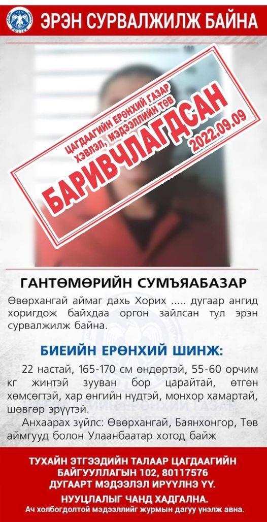 Тэгвэл өчигдөр буюу есдүгээр сарын 9-ний өдөр, 20.00 цагийн орчимд дээрх оргодлыг цагдаагийн алба хаагчид Баянхонгор аймгийн Галуут сумын нутаг дэвсгэрээс баривчиллаа гэж Цагдаагийн ерөнхий газраас мэдээллээ.