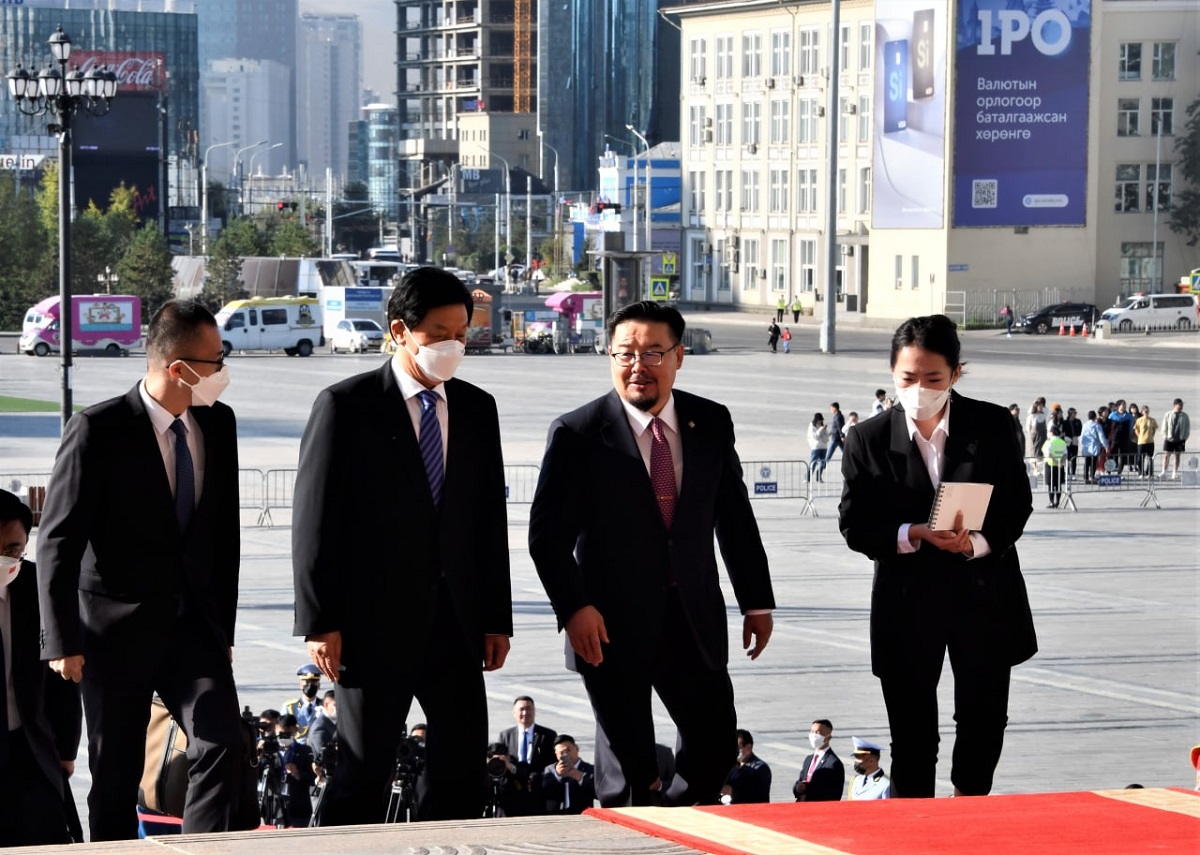 Улсын Их Хурлын дарга Г.Занданшатар өнөөдөр /2022.09.11/ Монгол Улсад албан ёсны айлчлал хийж буй БНХАУ-ын Бүх Хятадын Ардын Төлөөлөгчдийн Их Хурлын Тэргүүлэгчдийн дарга Эрхэмсэг ноён Ли Жаньшуг Жанжин Д.Сүхбаатарын талбайд угтан мэндчиллээ.