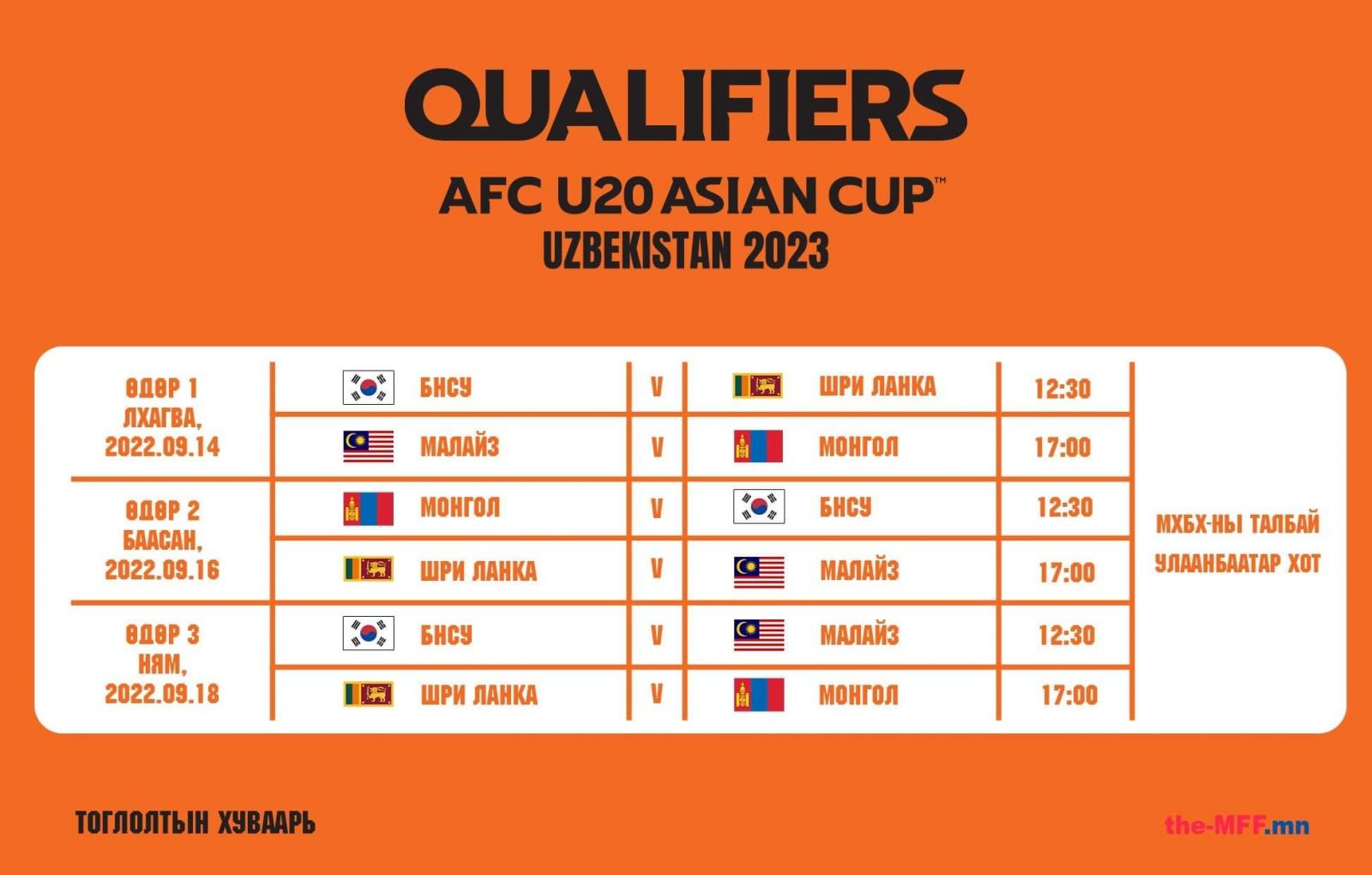 БНСУ, Малайз, Шри Ланка улсын багуудтай нэг хэсэгт багтсан Монголын 20-иос доош насны шигшээ баг хэсгийнхээ эхний хоёрт орвол дараагийн шатанд шалгарах боломжтой. Дэлхийн супер од хэмжээний хөлбөмбөгчдийг бэлтгэн гаргадаг БНСУ-ын өсвөр залуучуудын шигшээ багтай тоглоно гэдэг манай залууст том туршлага болох нь дамжиггүй.