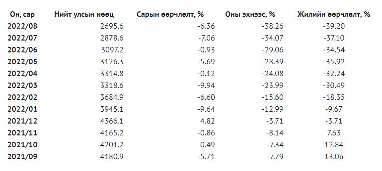 Гадаад валютын улсын нөөц наймдугаар сарын байдлаар 2695.6 сая ам.доллар болжээ. Долдугаар сард 2878.6 сая ам.долларын нөөцтэй гэж Төв банк мэдээлж байсан. Тэгвэл валютын нөөц өмнөх сараас 6.36 хувиар, оны эхнээс 38.26 хувь, жилийн өмнөхөөс 39.20 хувиар буурчээ.