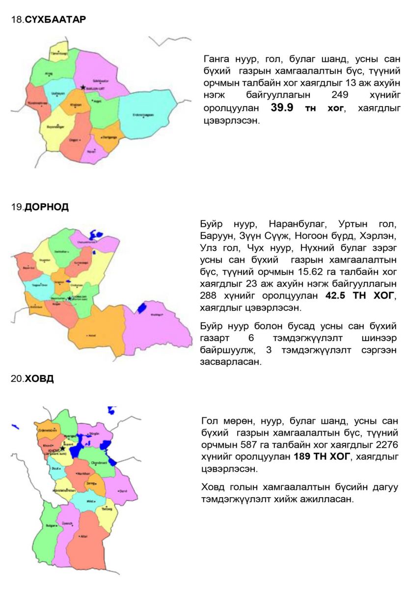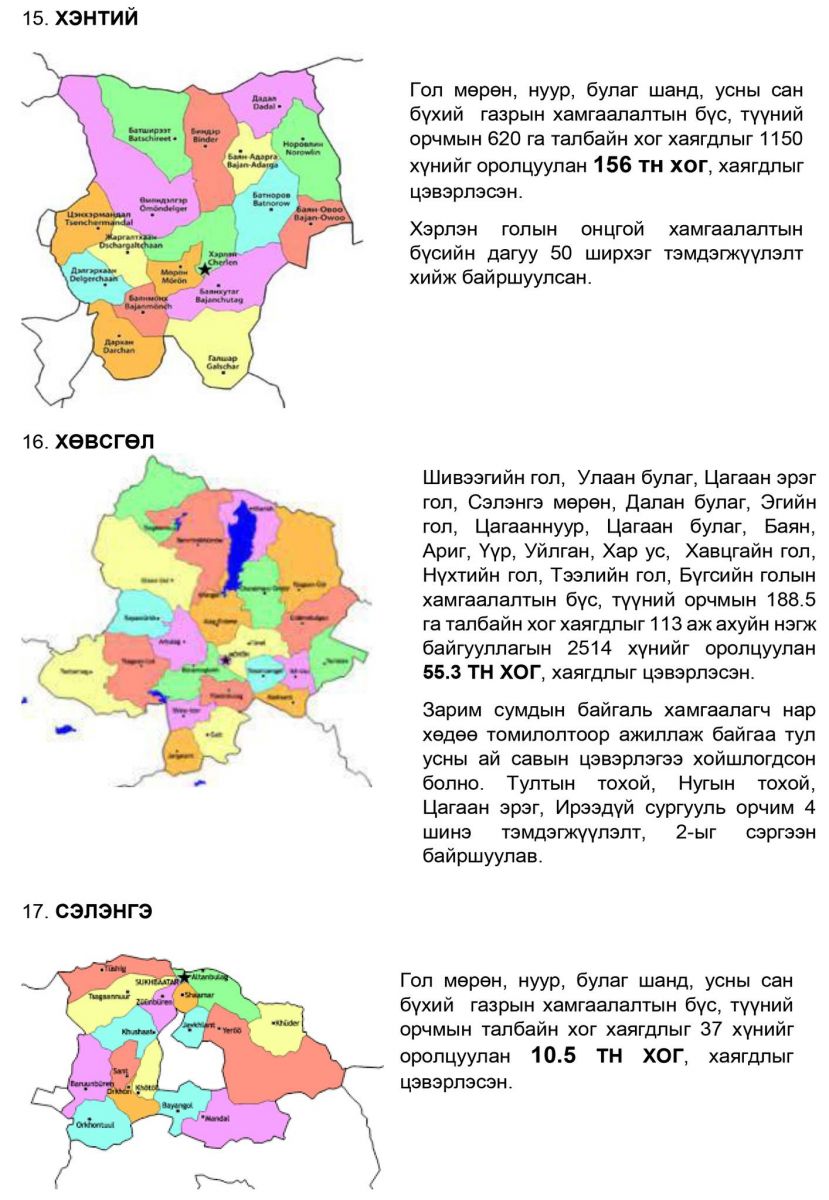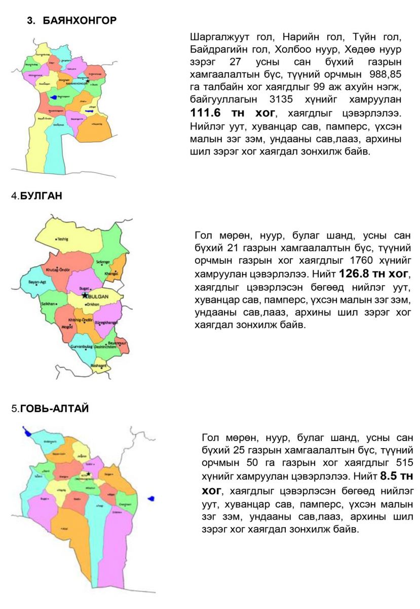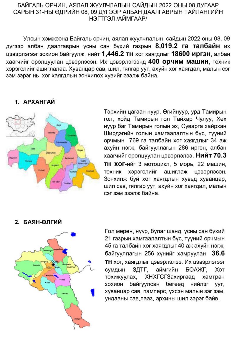 БОАЖ-ын Сайд Бат-Өлзийн Бат-Эрдэнэ-ийн албан даалгаврын хүрээнд усны сан бүхий газрын 8,019.2 га талбайн их цэвэрлэгээг зохион байгуулж, нийт 1,446.2 тонн хог хаягдлыг 18600 иргэн, албан хаагчийг оролцуулан цэвэрлэлээ.