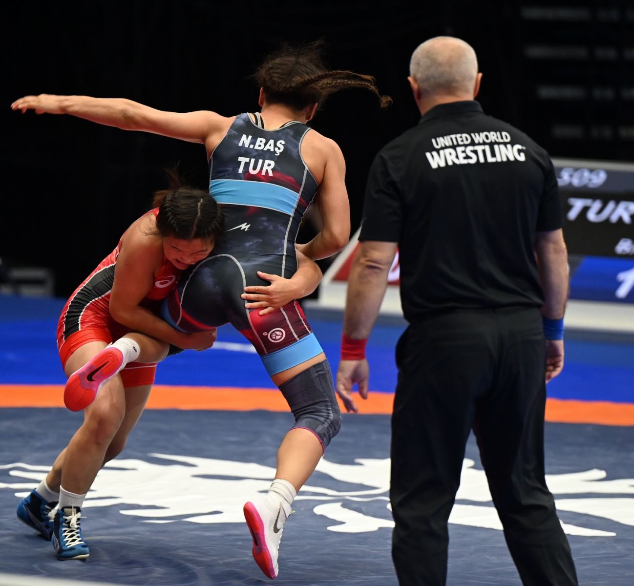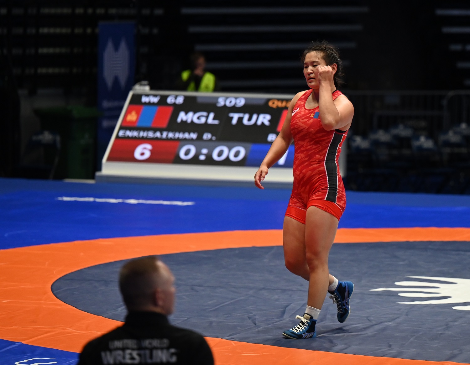 Эмэгтэй 68 кг-д Энхсайханы Дэлгэрмаа (Хүч) эхлээд Туркийн Несрин Бастай барилдлаа. Торгуулиар нэг оноо алдсан ч ард нь гарч оноог 2:1 болгосон. Удалгүй хөлд орж, түрж хөөгөөд 4 оноо авснаар барилдааны хувь заяаг шийдлээ.