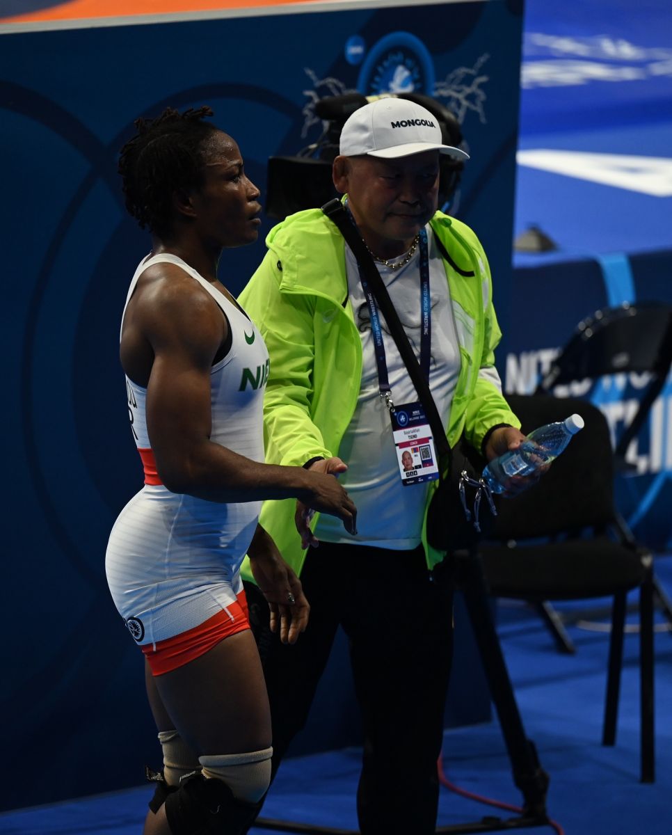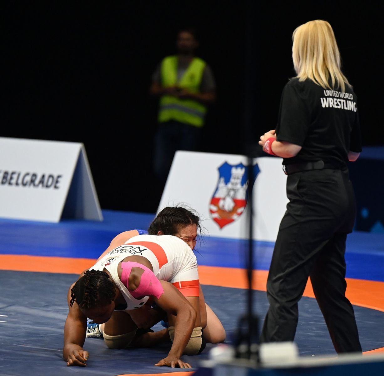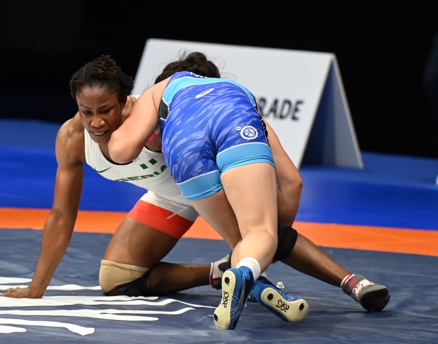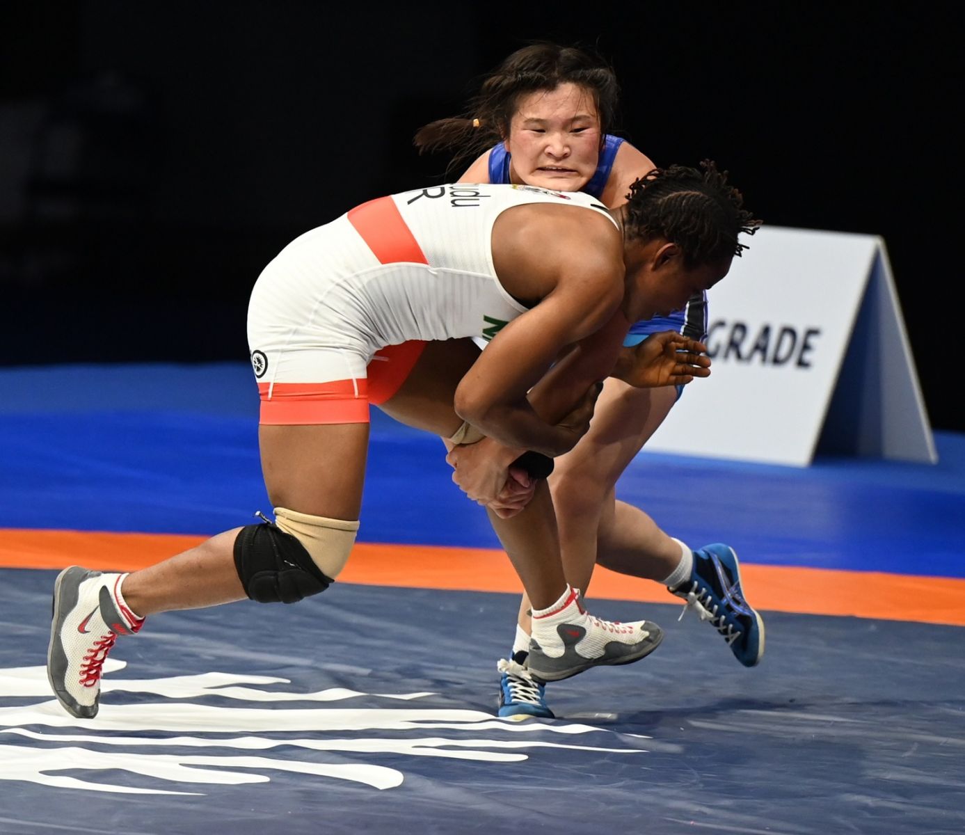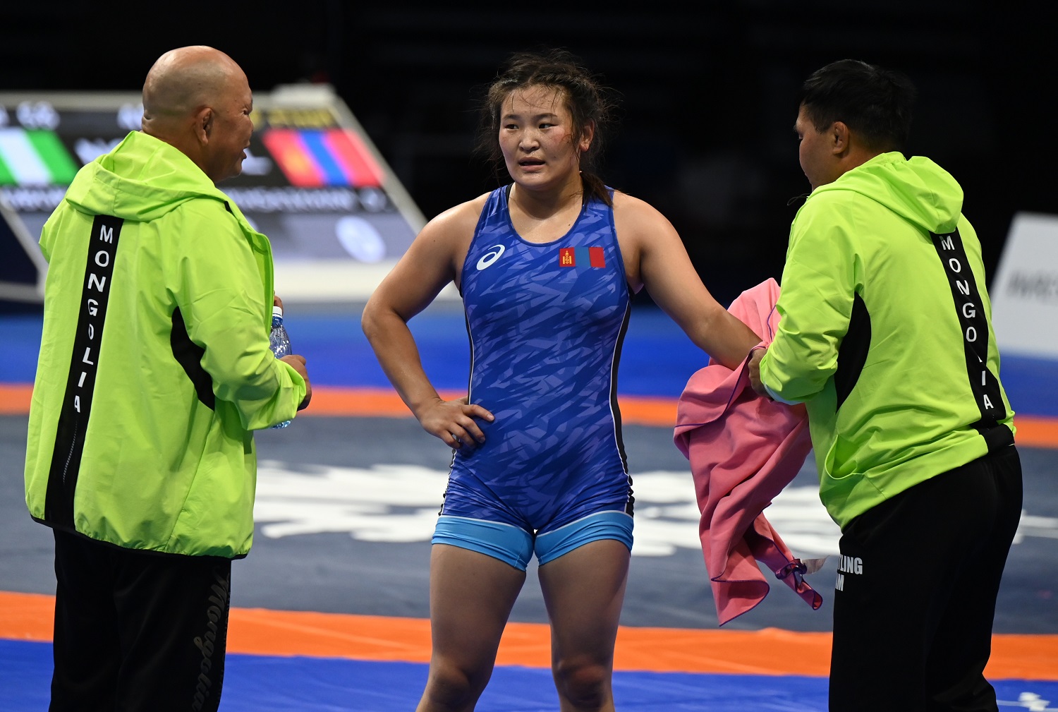 Эмэгтэй 68 кг-д Энхсайханы Дэлгэрмаа (Хүч) эхлээд Туркийн Несрин Бастай барилдаж, 6:1 оноогоор ялсан. Дараагийн тойрогт Токио олимпын мөнгөн медальт, Африкийн 11 удаагийн аварга Блессинг Оборудудутай барилдлаа. Эхний үед Блессинг 2:0 тэргүүлж байсан ч манай бөх сүүлийн минутад хөлд орж, ард нь гаран оноог тэнцүүлсэн. Ингээд маш сайн хамгаалан, сүүлийн оноогоор 2:2 ялалт байгууллаа. Одоо дэлхийн аварга Ирина Рынгачтай барилдана.