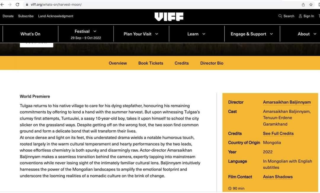 Канад улсад ажиллаж амьдарч байгаа Монголчууд https://viff.org/whats-on/harvest-moon/ холбоосоор орж кино тасалбар худалдан авах боломжтой гэнэ. Тус киног Гэр бүл, хүүхэд, залуучуудын хөгжлийн газар, Дэлхийн Зөн Монгол байгууллагууд дэмжиж ажилласан байна.