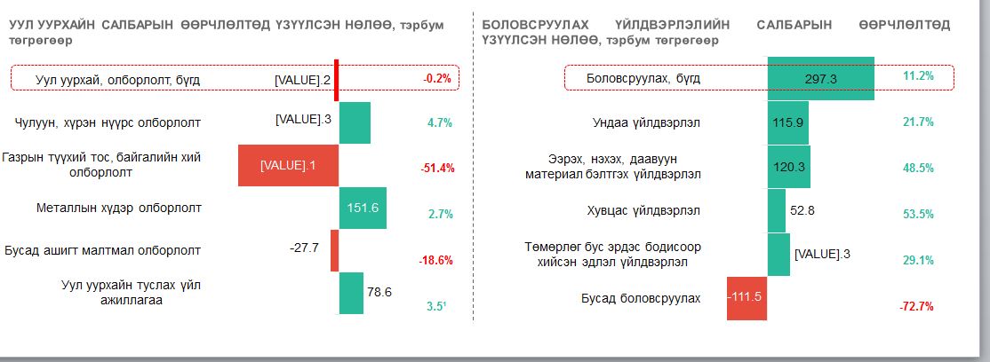 Энэ бууралтад газрын түүхий тос олборлолт 318.1 тэрбум төгрөг буюу 51.4 хувиар буурсан нь голлон нөлөөлжээ.