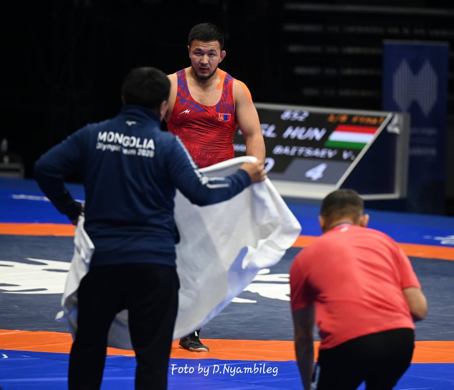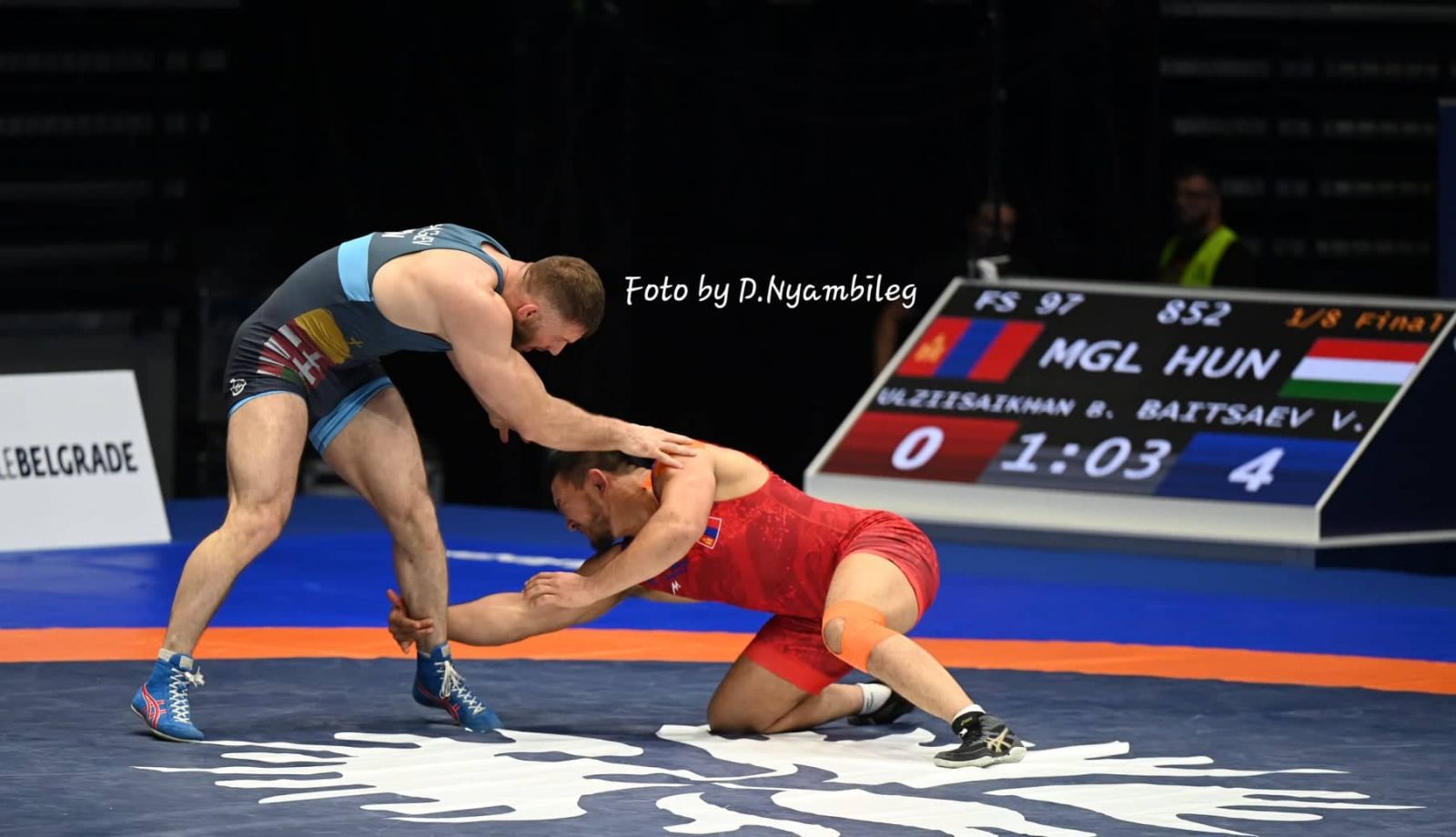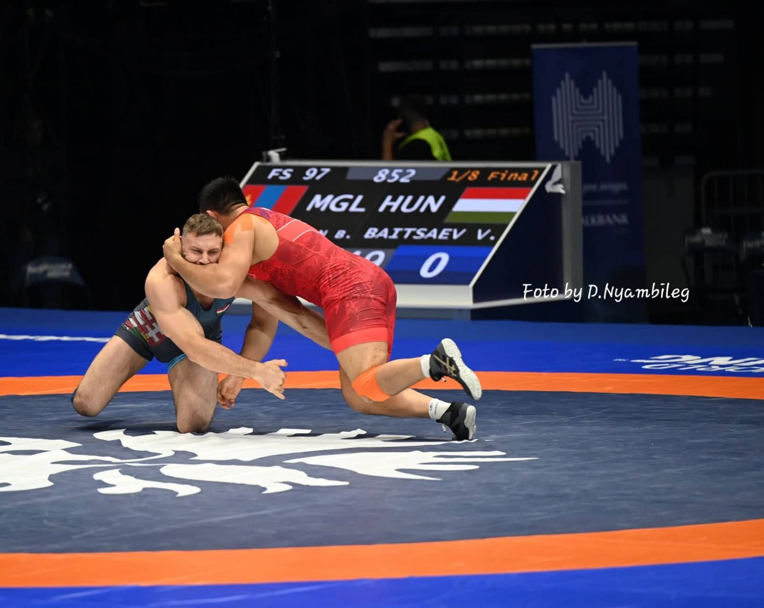 97 кг-д Өлзийсайханы Батзул (Хангарьд) барилдлаа. Эхний өрсөлдөгч нь Унгарын осетин бөх Владислав Борисович Байцаев. Европын аваргын бүх өнгийн медальтай, хашир туршлагатай бөх. 2021 онд Унгарын иргэншил авч, 2022 оны Европын АШТ-д мөнгөн медаль хүртсэн. Тэр эхний тойрогт Өмнөд Солонгосын бөхийг 5:0 ялсан юм.