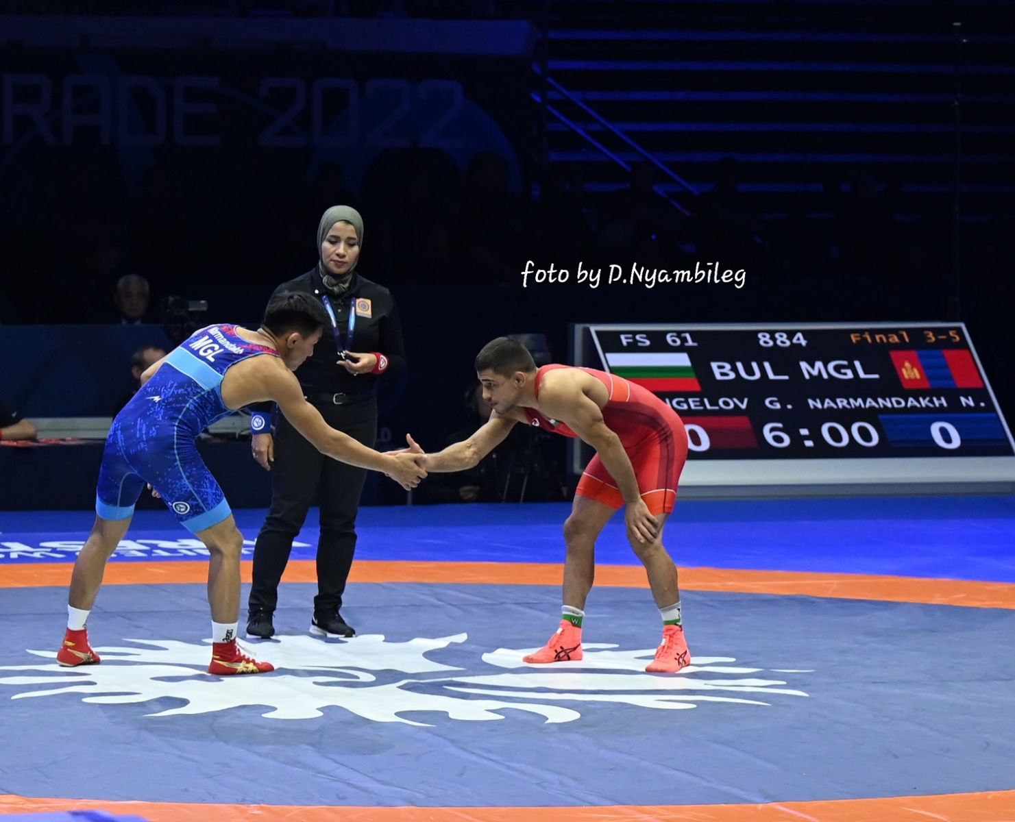 Өнөөдөр өглөө болсон дагах барилдаанд ялагчаар тодорсон Болгарын Георгий Вангелов түүний өөдөөс гарч ирлээ. Вангелов бол 2016, 2022 оны Европын аваргын хүрэл медальт, 2020 оны Дэлхийн Цомын хүрэл медальтай бөх.