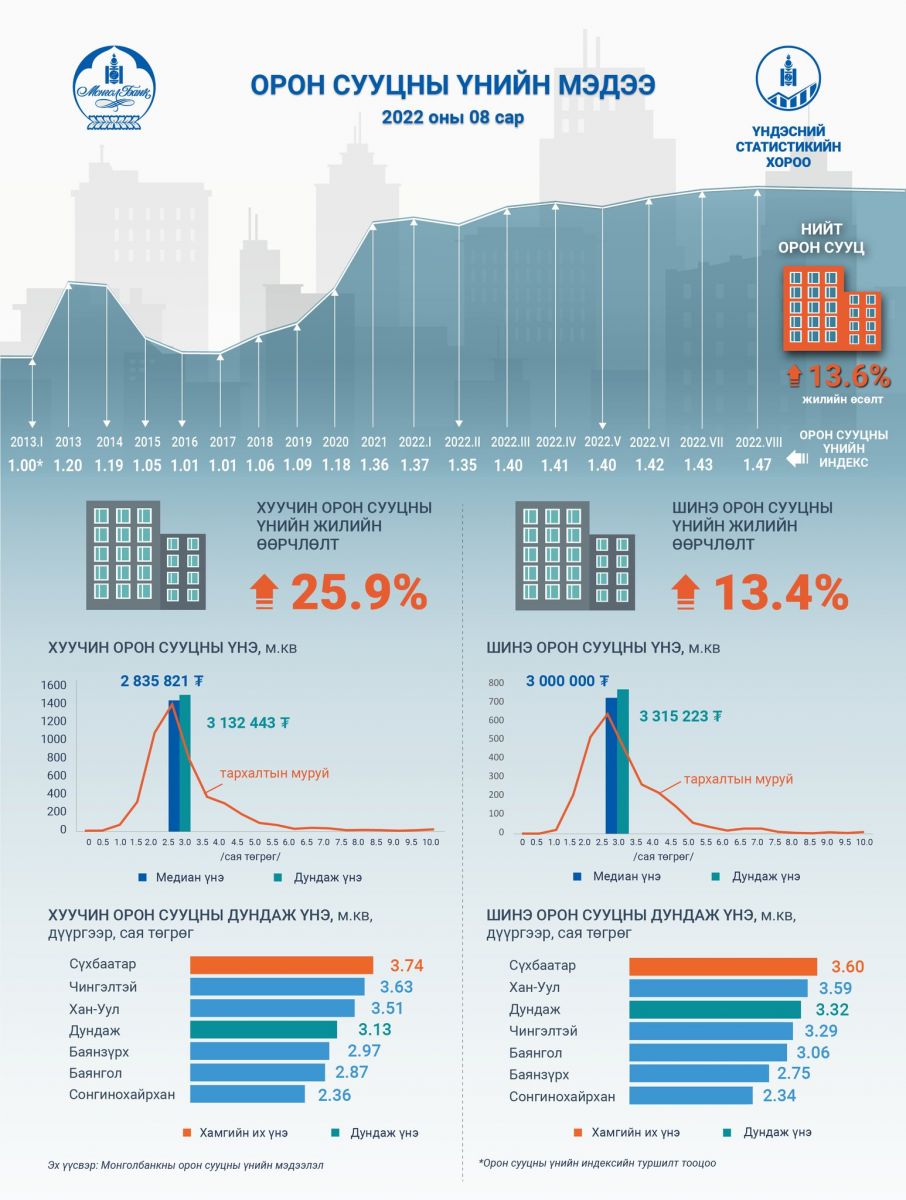 Харин хуучин орон сууцны 1 метр квадрат талбайн дундаж үнэ 3.13 сая төгрөг болж, Сүхбаатар дүүрэгт хамгийн их буюу 3.74 сая төгрөг байна. Хуучин орон сууцны үнэ жилийн өмнөхөөс 25.9 хувийн өсөлттэй байна.