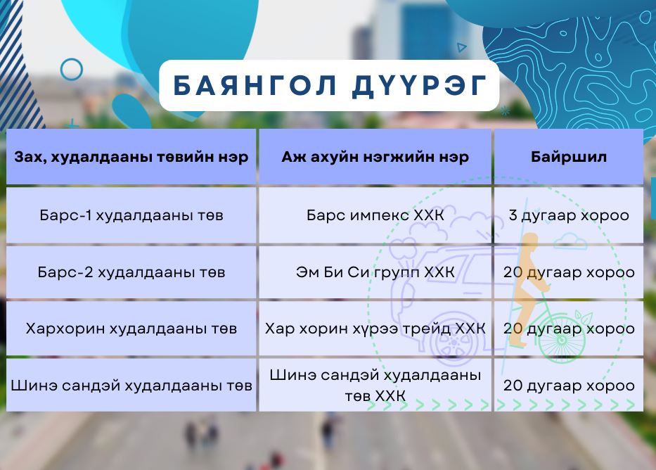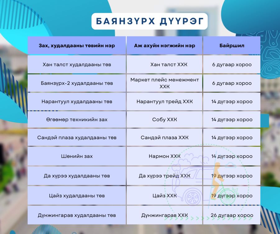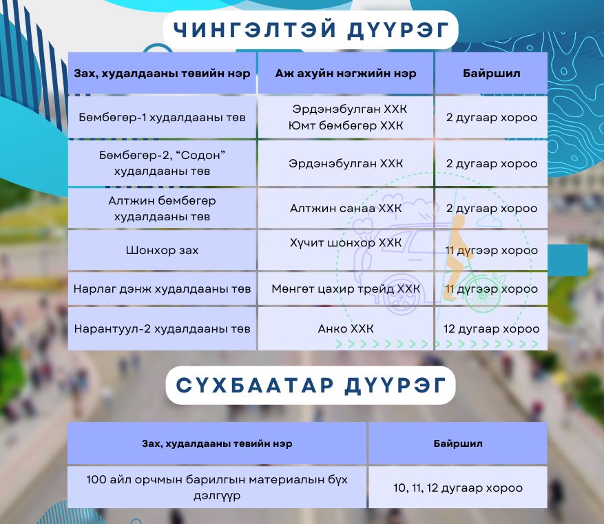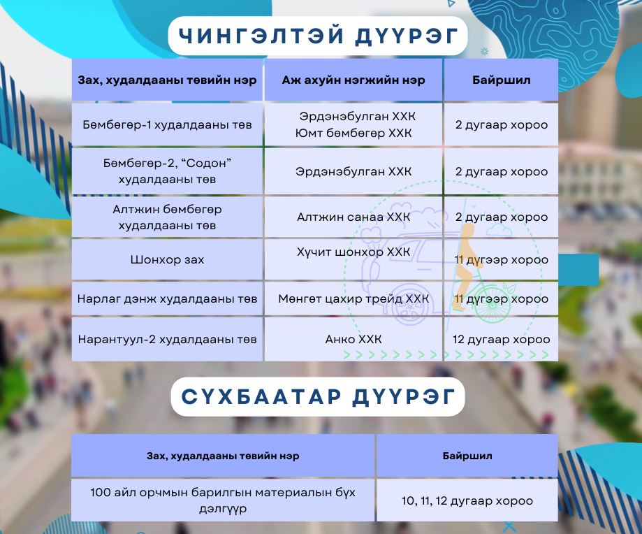 Энэ үеэр Чингэлтэй, Баянзүрх, Сүхбаатар, Баянгол дүүрэгт орших дараах 19 томоохон зах, худалдааны төв болон Зуун айл орчмын барилгын материалын бүх дэлгүүр амрахаар байна.
