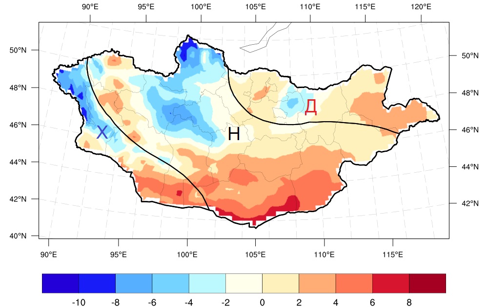 Төвийн аймгуудын нутгаар. Энэ сард агаарын дундаж температур Сэлэнгийн нутаг, Булганы ихэнх хэсэг болон Төвийн хойд хагаст олон жилийн дунджаас дулаан, бусад нутгаар дунджийн орчим, хур тунадас Хэнтийн нуруу орчмоор буюу Сэлэнгийн зүүн, Төвийн зүүн хойд хэсгээр олон жилийн дунджаас ахиу, бусад нутгаар дунджийн орчим байна.