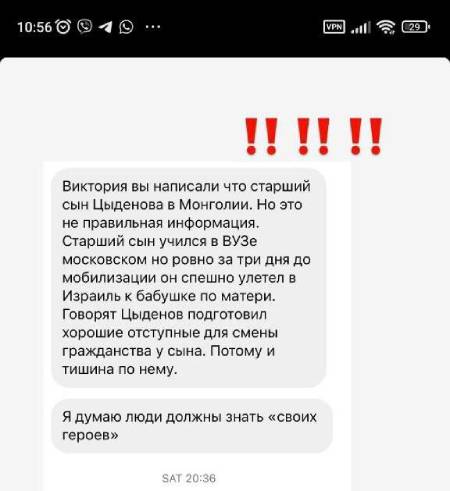 Өнөөдөр Алексей Цыденов мэдэгдэл хийж, дээрх цуурхалд няцаалт хийлээ. Цыденов “Миний хүү Москвагийн Бауманы нэрэмжит их сургуулийн оюутан. Одоо Москвад сургуульдаа яваад байж байгаа. Монголд ч, Израилд ч очоогүй. Манай эхнэрийн талын аав, эмээ, өвөө нь нас барсан, Читад оршуулсан. Хадам ээж минь одоо Москвад амьдардаг. Харин эхнэрийн төрсөн ах нь хэсэгчилсэн татлагад хамрагдаад цэрэгт явсан. 49 настай хүн, танкчнаар хуваарилагдсан байсан” гэж мэдэгдлээ.