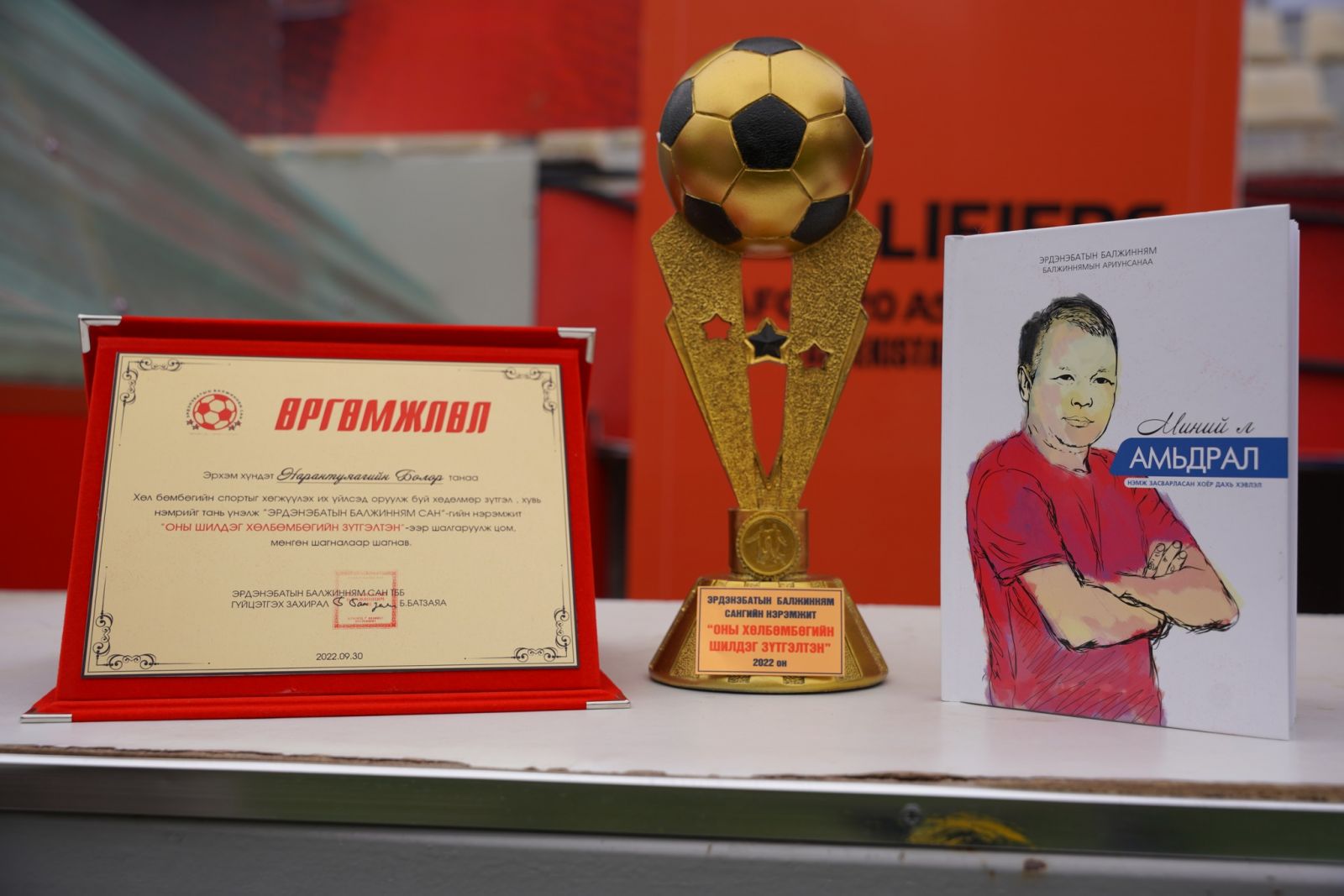 Монголын нэрт тайлбарлагч “Эрдэнэбатын Балжинням Сан” ТББ- аас жил бүр Монгол улсад хөлбөмбөгийн спортын хөгжлийн төлөө зүтгэж буй бүхий л насныхны дунд “ОНЫ ШИЛДЭГ ХӨЛБӨМБӨГИЙН ЗҮТГЭЛТЭН” хэмээх шагналыг бий болгон шалгаруулахаар зорьж хамгийн эхний буюу 2022 оны шилдэг хөлбөмбөгийн зүтгэлтэн шагналыг өнөөдөр ийнхүү гардууллаа.