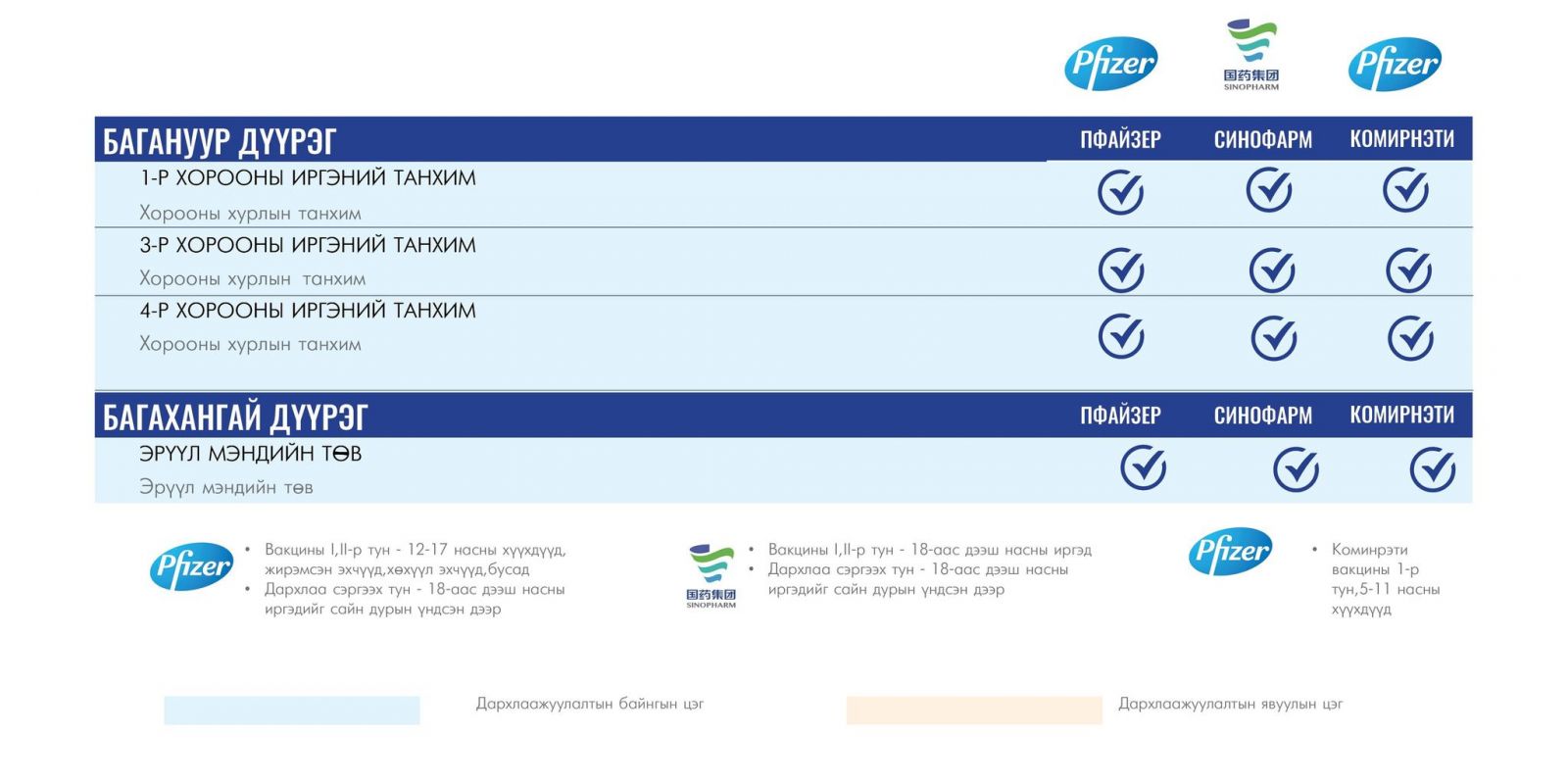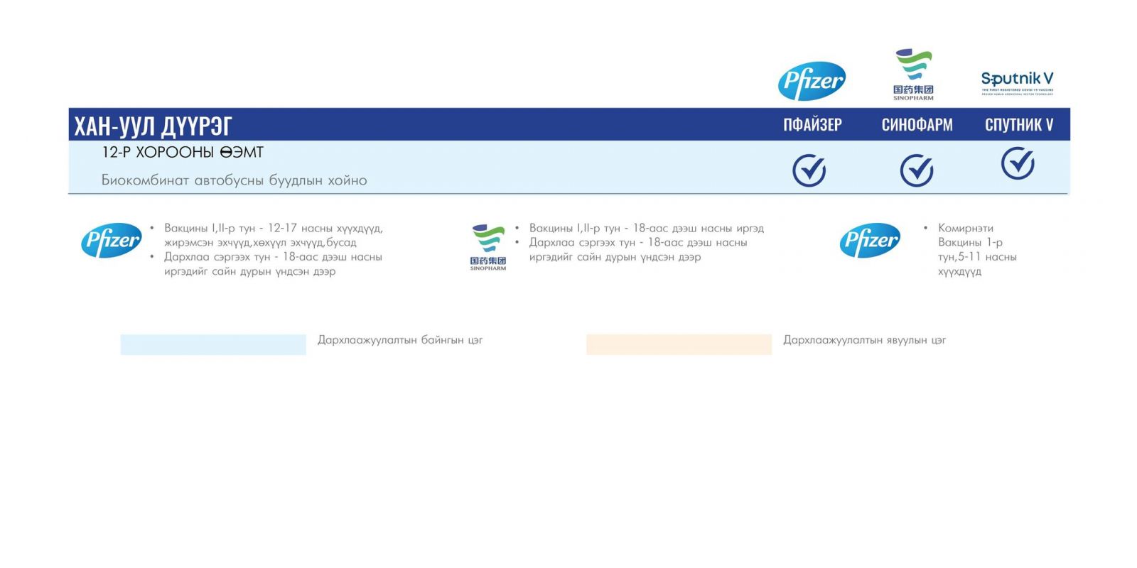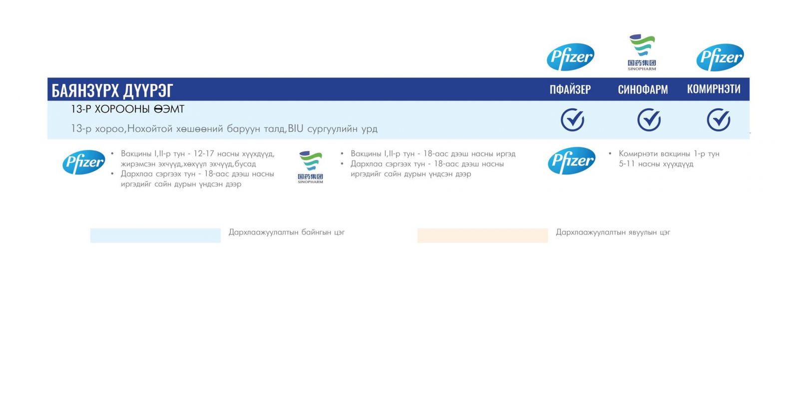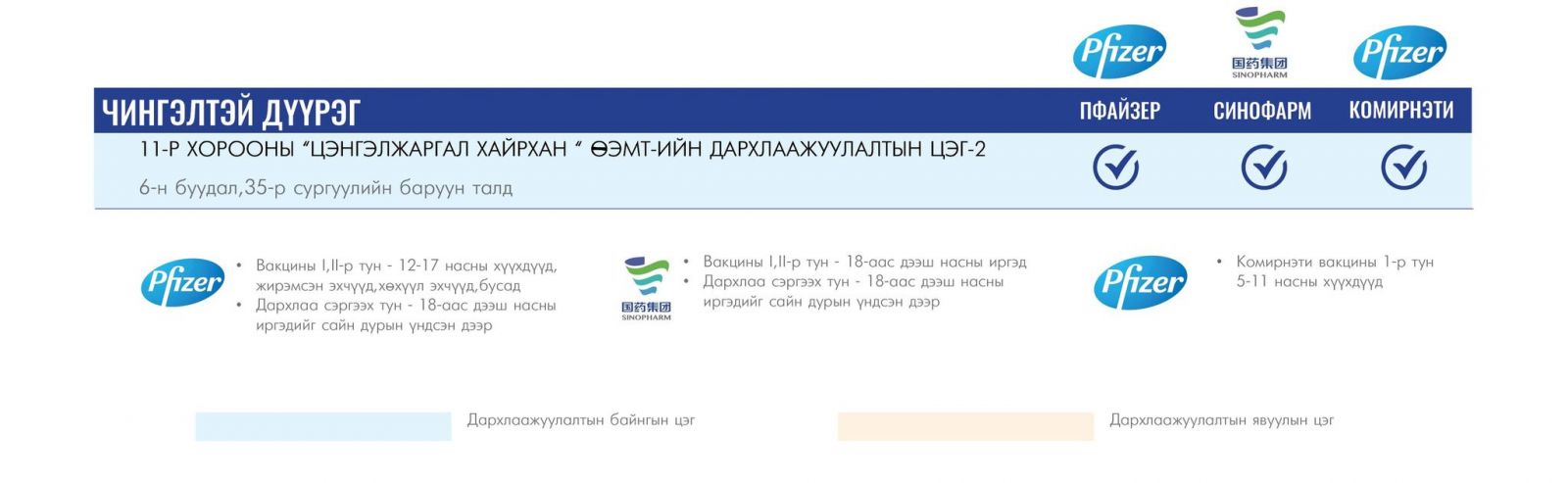2022.10.01-нд Улаанбаатар хотод суурин 11 цэгээр 11 багийн 41 эмч, ажилтан ажиллана. Та өөрт ойр вакцины аль ч цэгт очиж дархлаажуулалтад хамрагдах боломжтой. Дархлаажуулалтын цэгүүд 10:00-15:00 цаг хүртэл ажиллана.