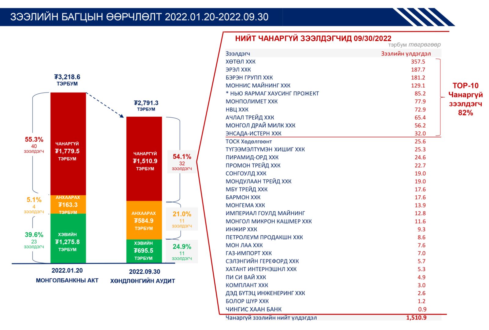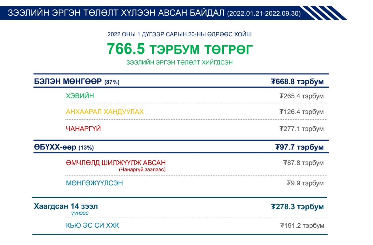 Хөгжлийн банканд энэ оны 1 дүгээр сарын 20-ны өдрөөс 9 дүгээр сарын 30-ны өдрийн хооронд нийт 766.5 тэрбум төгрөгийн зээлийн эргэн төлөлт хийгджээ. Үүнээс бэлэн мөнгөөр 668.8 тэрбум төгрөгийн зээл, өмчлөх бусад үл хөдлөх хөрөнгөөр 97.7 тэрбум төгрөгийн зээл төлөгдсөн байна. Мөн 14 зээл бүрэн төлөгдөж хаагдсан байна.