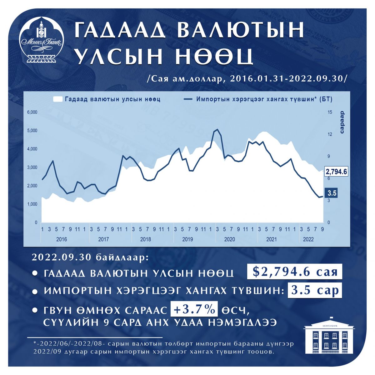 Гадаад валютын улсын нөөц есдүгээр сарын 30-ны өдрийн байдлаар 2,794.6 сая ам.доллар болжээ. Энэ нь 3.5 сарын импортын хэрэгцээг хангах түвшин бөгөөд өмнөх сараас 3.7 хувиар өссөн дүн юм. Сүүлийн есөн сард анх удаа гадаад валютын нөөц өслөө гэж Төв банкнаас мэдэгдэж буй юм.