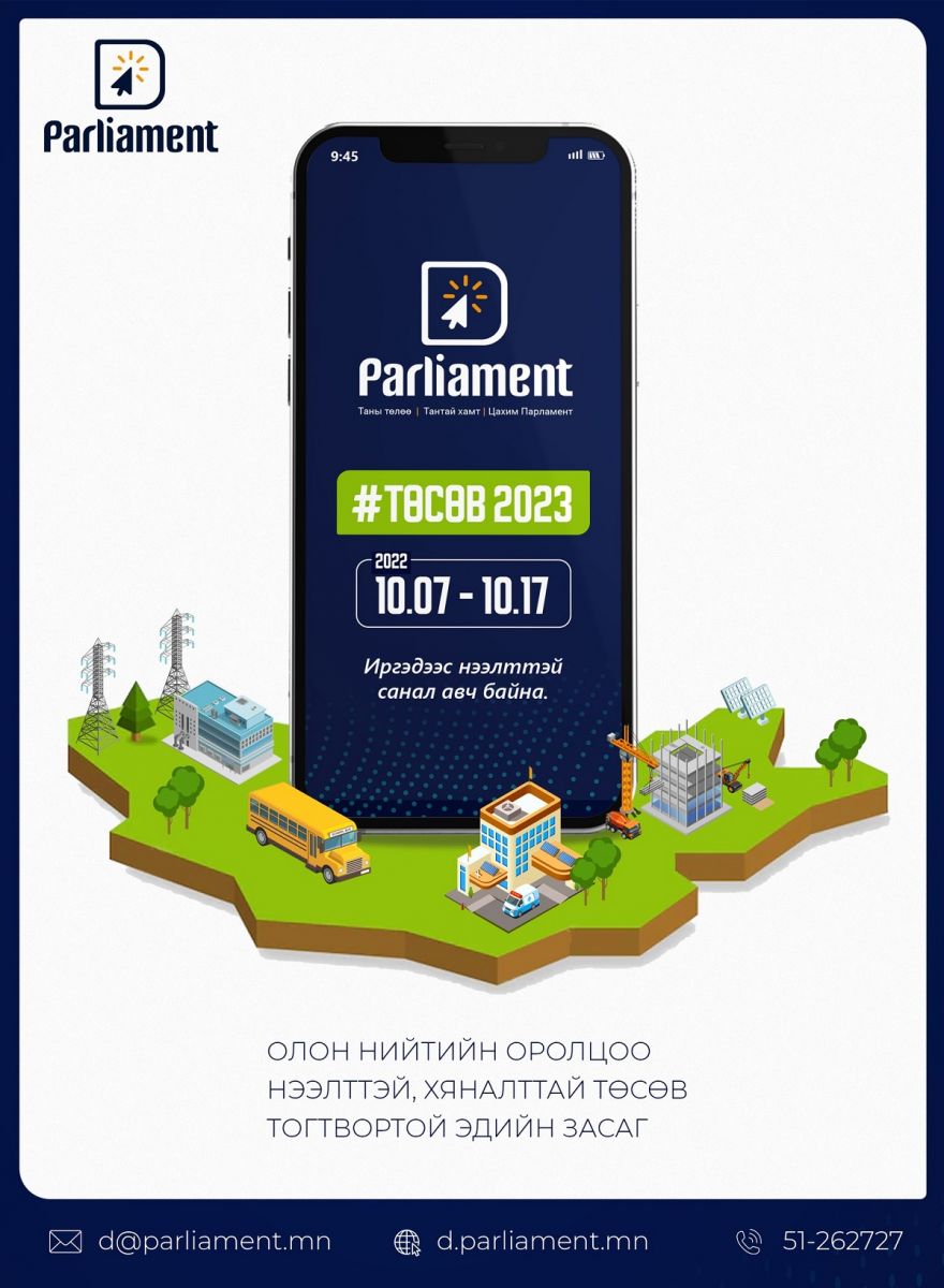 2023 оны төсөвт иргэдийн санал бодлыг “D-parliament” апплейкшнаар дамжуулан 10 дугаар сарын 17-ныг хүртэл авч байна. УИХ-ын гишүүд болон холбогдох байнгын хороодын гишүүд иргэдээс ирүүлсэн саналтай танилцан 2022 оны 10 дугаар сарын 19-ны өдөр Төсөв-2023 Нээлттэй хэлэлцүүлгийг зохион байгуулахаар төлөвлөж байна.