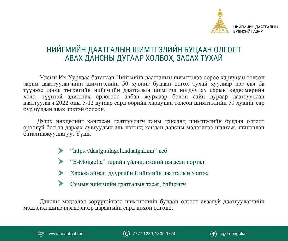 Дээрх нөхцөлийг хангасан даатгуулагч таны дансанд шимтгэлийн буцаан олголт ороогүй бол та дараах сувгуудын аль нэгэнд хандан дансны мэдээллээ шалгаж, шинэчлэн баталгаажуулна уу: