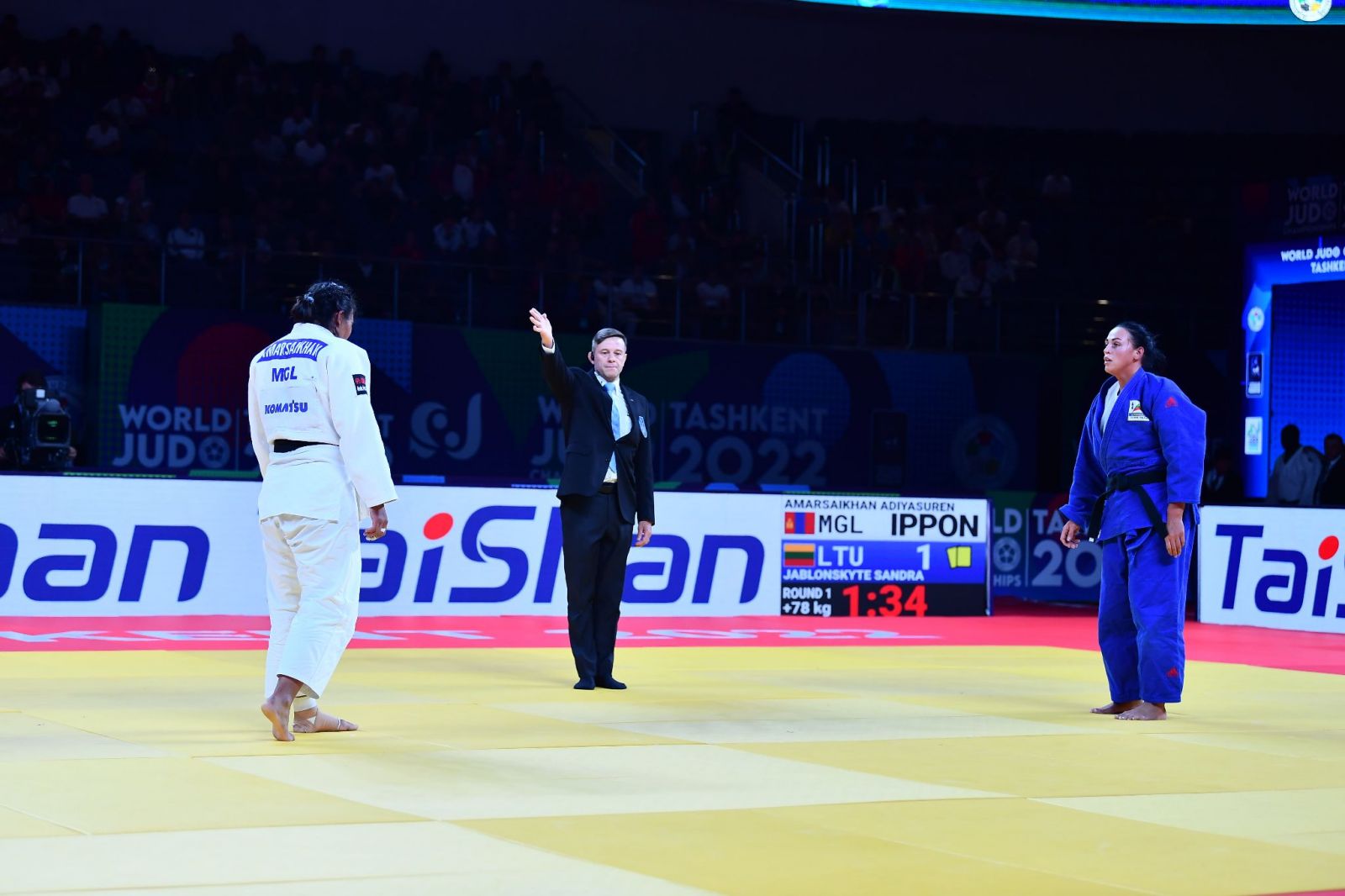 Түүний эхний өрсөлдөгч нь Литвагийн Сандра Яблонскитэ байлаа. Манай бөх эхний минутад вазари алдсан ч тун удалгүй баруун тохож, вазари аваад, дамжуулан даралт яваад цэвэр яллаа.