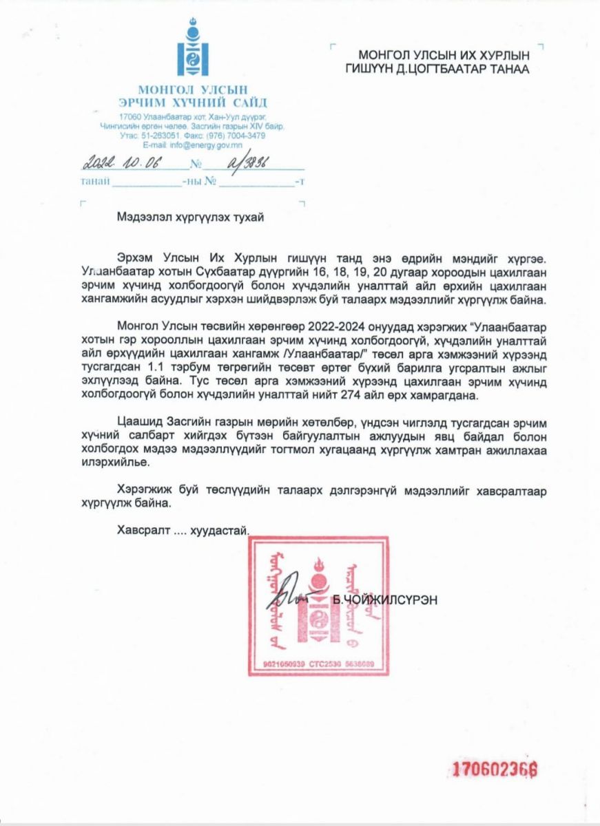 УИХ-ын гишүүн Д.Цогтбаатар өөрийн бүрэн эрхийнхээ хүрээнд иргэд, сонгогчдоосоо ирсэн саналын дагуу Эрчим хүчний сайд Б.Чойжилсүрэнд хүсэлт хүргүүлсэн билээ.