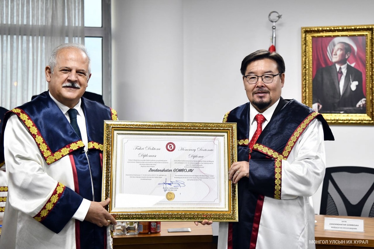 Мөн Монгол, Туркийн харилцаа, тэр дундаа Монгол Улсын Их Сургууль болон Измир Катип Челеби их сургуулийн хамтын ажиллагааг өргөжүүлэх, хоёр их сургуулийн байгуулсан Түрэг судлалын хамтарсан хүрээлэнгийн баг археологийн судалгааны ажлуудаа амжилттай явуулахад бодит хувь нэмэр оруулж, дэмжлэг үзүүлж ирсэн явдлыг нь үнэлэн  тус их сургуулийн Эрдмийн зөвлөлийн гишүүд санал нэгтэйгээр “Хүндэт доктор” цол олгохоор шийдвэрлэсэн гэж байлаа.